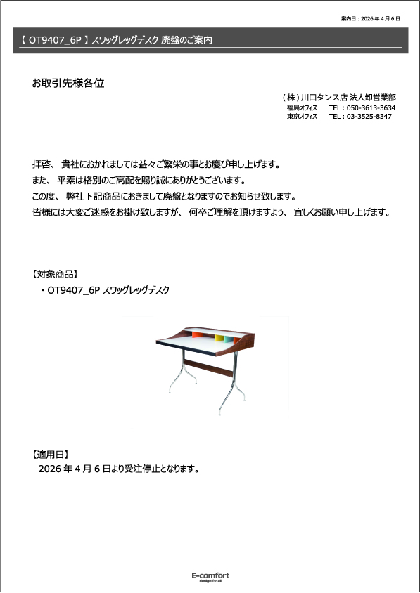この度、誠に勝手ながら【OT9407_6P スワッグレッグデスク】につきまして、